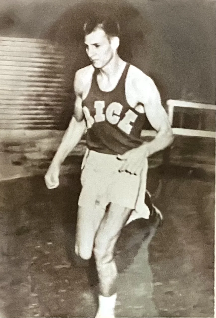 Alvin High School (AHS) Honors: He was the first four-sport letterman at AHS after World War II, earning accolades in football, basketball, baseball, and track. In 1949, his senior year, he won the state mile run title. His sister Alice recounted that he accomplished this feat the day after he severely cut both arms delivering milk for the family dairy farm. He also claimed runner-up honors in a national meet in Iowa.